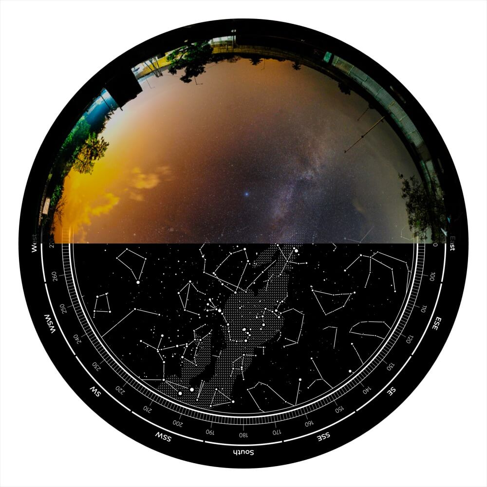 The star map shows the projection of the visible sky with the cardinal directions (North, South, East, West) indicated. The stars that are close to the edge of the circle were closer to the horizon in your chosen moment, while stars close to the center of the circle were visible right above your head. The size of each dot indicates the apparent magnitude of the star. The celestial hemisphere projected to a plane above it.